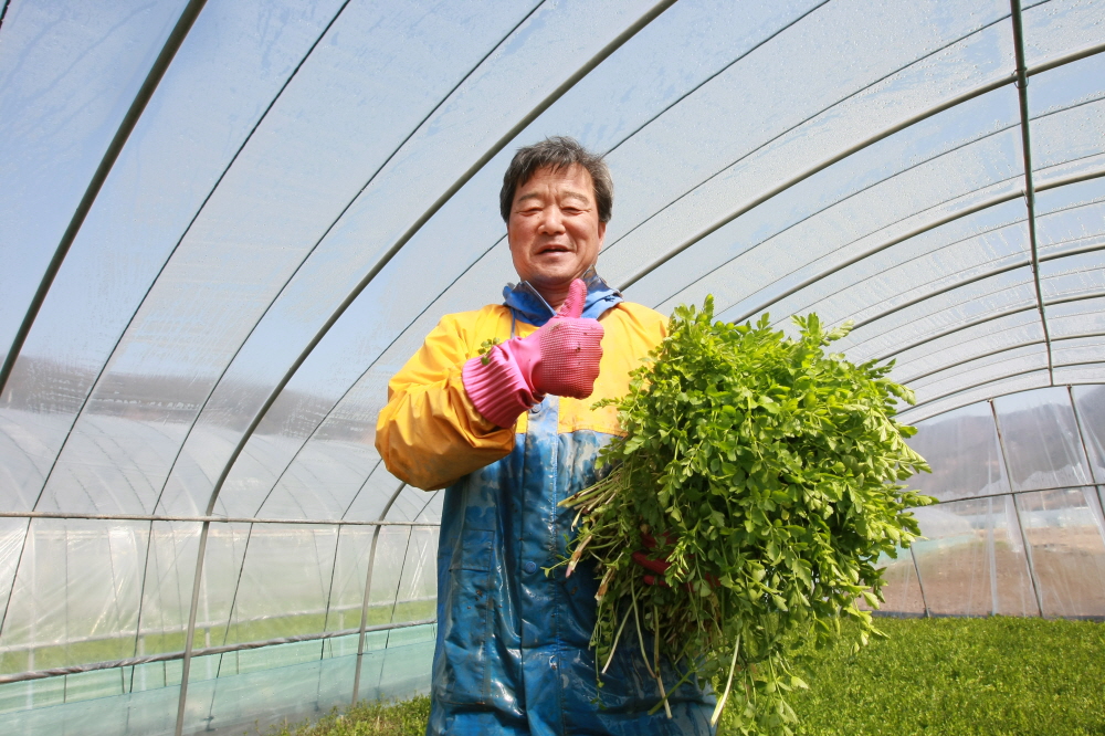 정성스레 키운 미나리를 낫으로 베는 모습입니다.