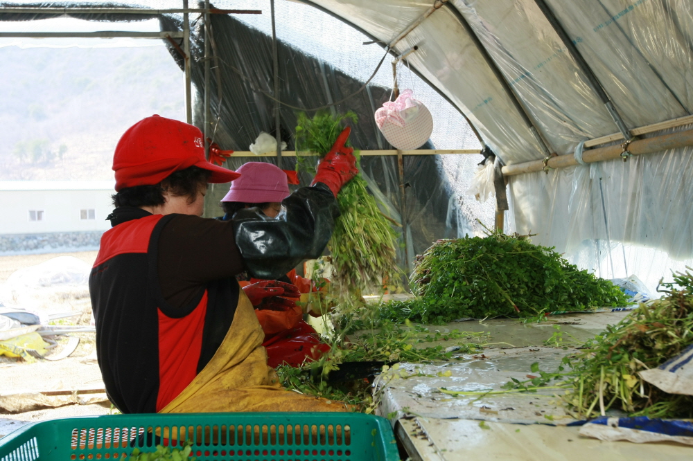 미나리를 다듬는 모습입니다.